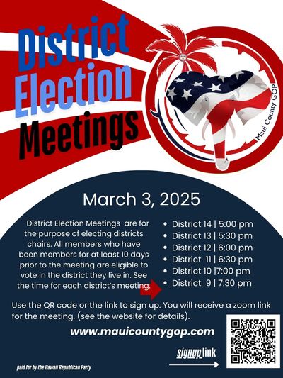 The Maui County Executive would love everyone, who is eligible, to participate in the Maui County District Election Meetings. Please pre-register for the D.E.M.s. to receive a zoom link. (see the instructions below) Maui County Executive Committee asks that you to do this, so that they can VERIFY that every participant has the appropriate credentials; Participants must be a #1) registered voter and #2) a member of the Hawaii Republican Party by February 22nd 2025 at 5:01pm* in order to vote. If you do no we can help you get these.